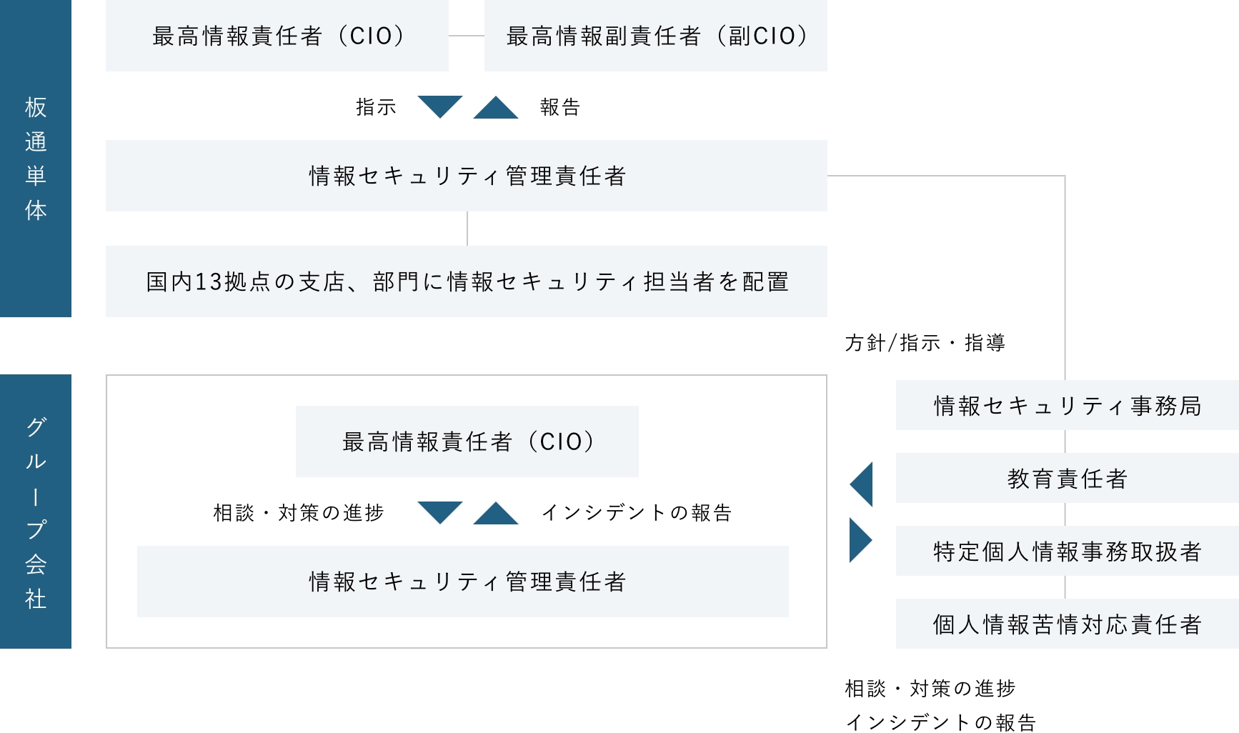 板通は安定した経営基盤を支えるために、 情報セキュリティ基本方針の策定、セキュリティ基盤の拡充、マルウェア等に対応する技術的なセキュリティ対策強化等を実施し、情報資産に対する危機管理対応の徹底に継続して取組んでいます。